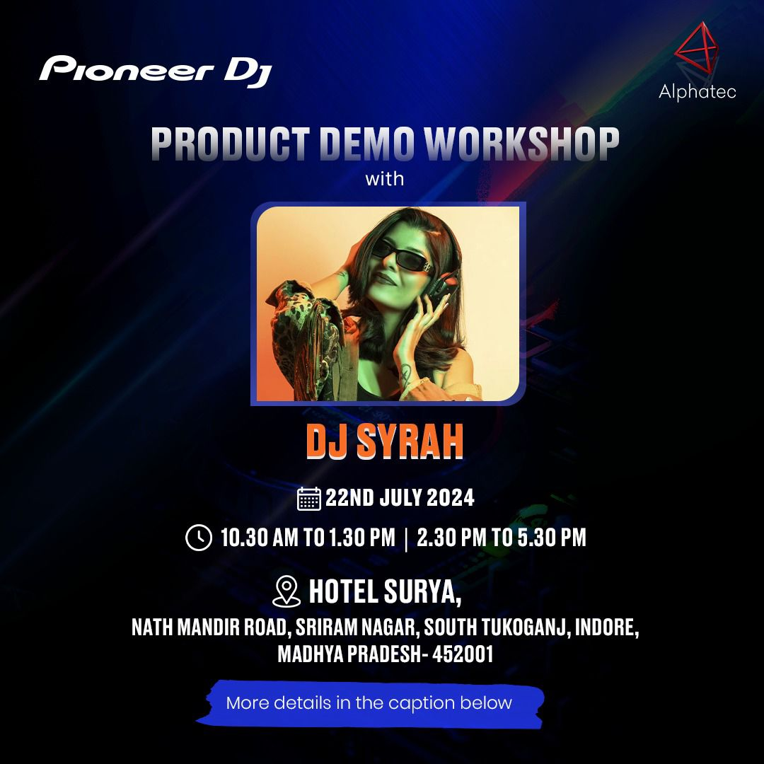 Attention DJs and Producers! Be a part of learning in your city. Pioneer DJ India is thrilled to announce its Product Demo Workshop in Indore. Join us for an exclusive hands-on experience and dive into the latest Pioneer DJ equipment, including the Omnis Duo, Opus Quad, CDJ-3000, DDJ-FLX10, and more, alongside DJ Syrah. Don't forget to register today, follow us, and tag your friends in the comments to enter an exclusive giveaway by Pioneer DJ India! Date: 22nd July 2024 Venue: HOTEL SURYA, Nath Mandir Road, Sriram Nagar, South Tukoganj, Indore, Madhya Pradesh, 452001z