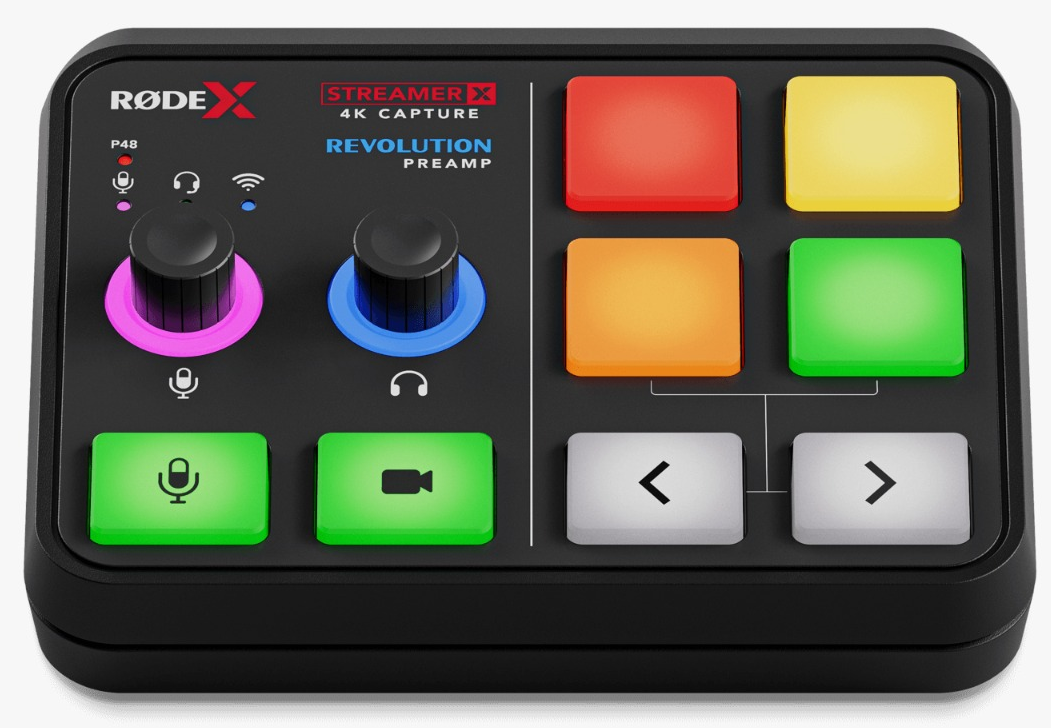 Audio Interface and Video Capture Card The ultimate all-in-one streaming solution. The Streamer X is a professional video capture card, audio interface and control surface integrated in one compact device that makes creating incredible content incredibly easy. It features studio-grade audio inputs for XLR microphones and instruments, headsets and RØDE wireless microphones, with an ultra-low-noise, high-gain Revolution Preamp™ and powerful APHEX® audio processing delivering pristine sound quality. HDMI connections offer up to 4K30 streaming and 4K60 pass-through for incredible video quality in a wide range of applications, from streaming and gaming, to podcasting and content creation, to business presentations. Dual USB-C connections seamlessly accommodate dual PC setups, and four fully customisable SMART pads allow for on-the-fly triggering of sound or voice FX and other actions on a computer.